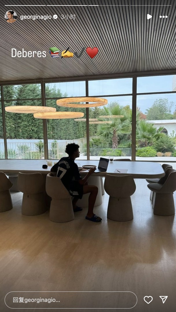 在乔治娜晒出的照片中,C罗的儿子迷你罗穿着曼联客场球衣在用笔记本电脑学习,该球衣的号码是17号,是前锋加纳乔的号码。