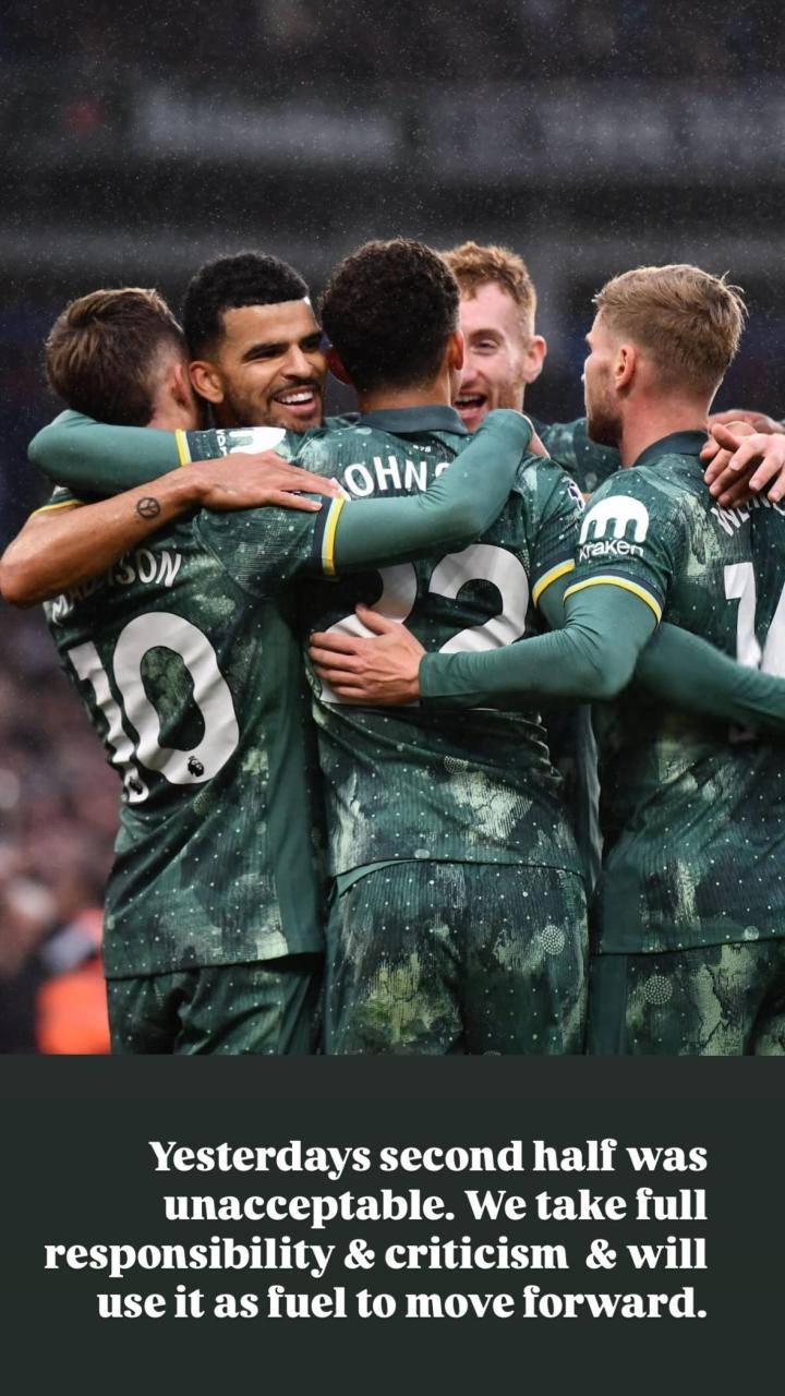 比赛结束后第二天,打入一球的热刺中场麦迪逊更新社交媒体,写道:“昨天下半场的表现是不可接受的,我们对此负全责,并接受批评,同时将其作为前进的动力。”