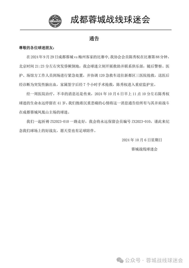 经一周医院治疗,不幸的消息还是传来,2024年10月6日早上11点10分左右陈秀权球迷的生命永远停留在41岁,我们抱着沉重悲痛的心情将这一消息通告给所有与其并肩战斗在成都蓉城凤凰山主场的球迷。
