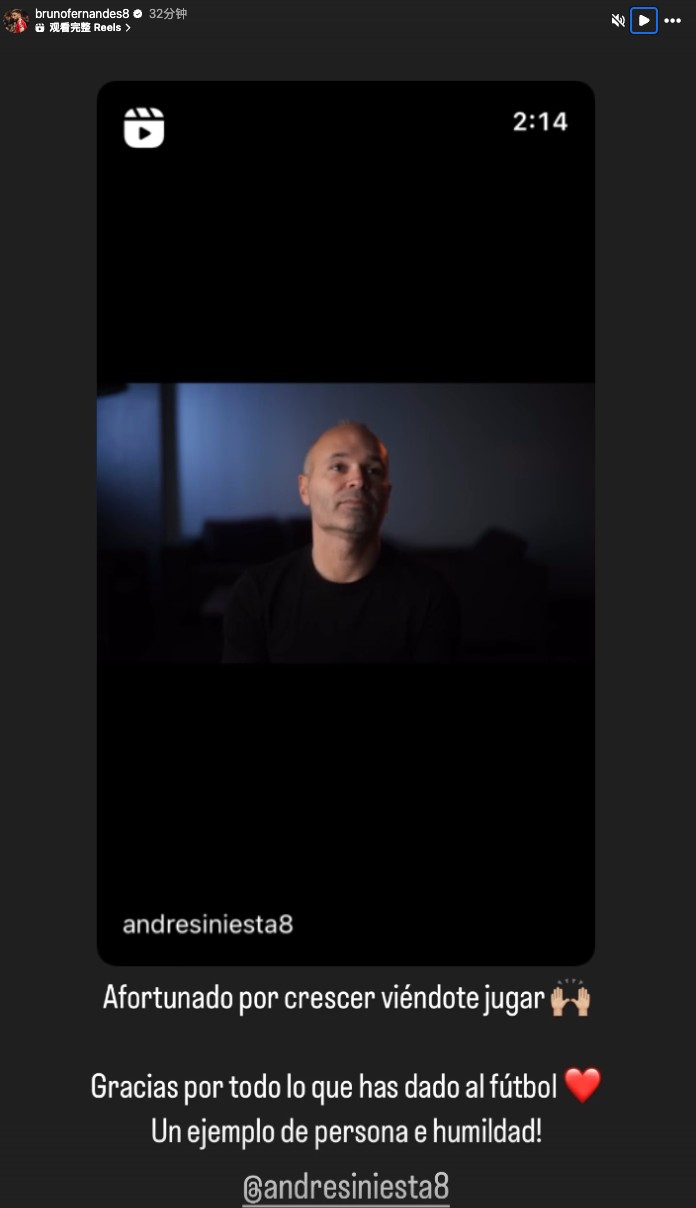 曼联中场布鲁诺-费尔南德斯在社交媒体转发了伊涅斯塔的视频,并写道:“很幸运能在成长过程中看到你踢球。
