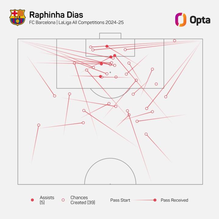 据Opta统计,拉菲尼亚在本赛季代表巴塞罗那出场的所有比赛中创造了39次机会,为所有五大联赛球员中最多。