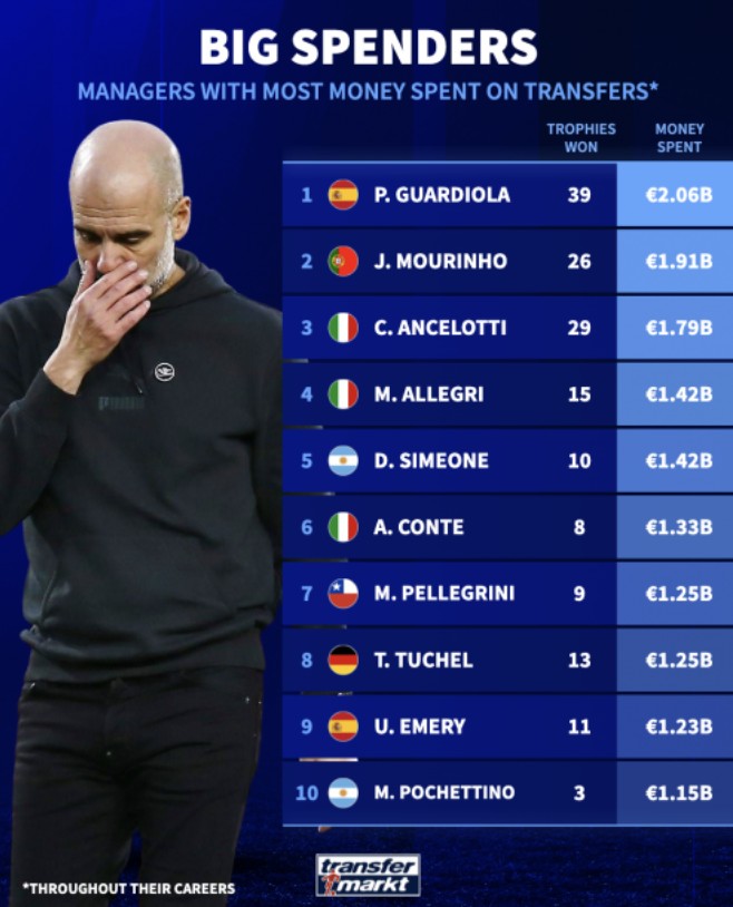 最近,德国转会市场盘点了主教练引援支出榜Top10,其中,瓜迪奥拉支出20.6亿位列榜首。