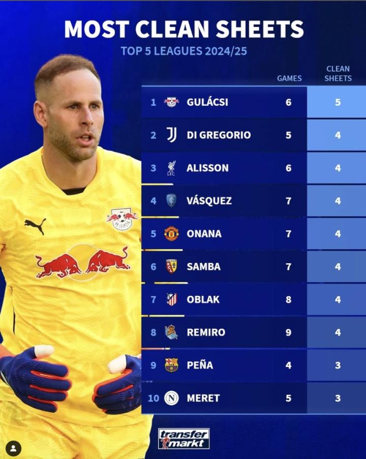 北京时间10月9日,德国转会市场统计了本赛季五大联赛门将的零封场次(仅联赛),并列出了具体榜单。