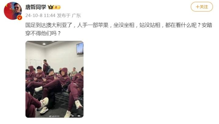 昨天,历史博主“唐哲同学”在微博里发了一张国足众将的机场照,并且批判道:“国足到达澳大利亚了,人手一部苹果(手机),坐没坐相,站没站相,都在看什么呢?安踏穿不得他们吗?”此动态发出后,也引发了热议。
