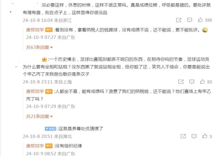 评论区里,有网友认为这位博主没有必要这么“上纲上线”批评。对此,该博主回复道——“看到没有,拿着纳税人的钱踢球,没有成绩不说,还不能说,更不能批评。”、“人都坐不直,能有成绩吗?浪费了我们的纳税钱,还不能说?”