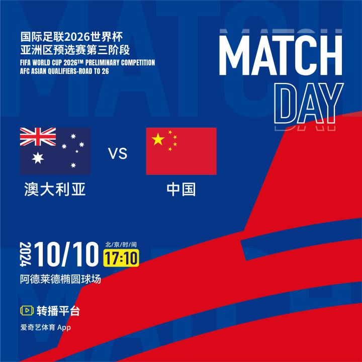 北京时间10月10日下午5:10,18强赛小组赛第三轮,中国国家队将在客场阿德莱德椭圆形体育场迎战澳大利亚国家队。