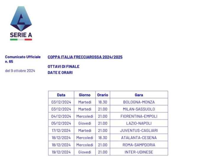 意甲联盟官方确认了本赛季意大利杯16强具体赛程,卫冕冠军尤文图斯主场与卡利亚里的比赛将在北京时间12月18日凌晨4时进行,此外AC米兰vs萨索洛和国际米兰vs乌迪内斯将分别在12月4日凌晨4时以及12月20日凌晨4时进行。