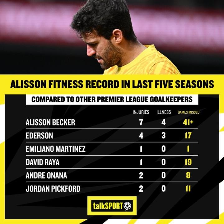 利物浦门将阿利松在与水晶宫一役中受伤被替换下场,他很有可能因伤缺席大约六周的时间。对此,英媒talkSPORT统计出了该球员过去5个赛季的伤病次数和缺席比赛场数,并与英超联赛其他守门员进行了对比。