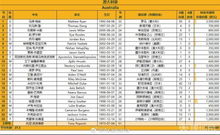 据统计,这份名单澳大利亚队的平均年龄为27.3岁,德转总身价为3715万欧元。