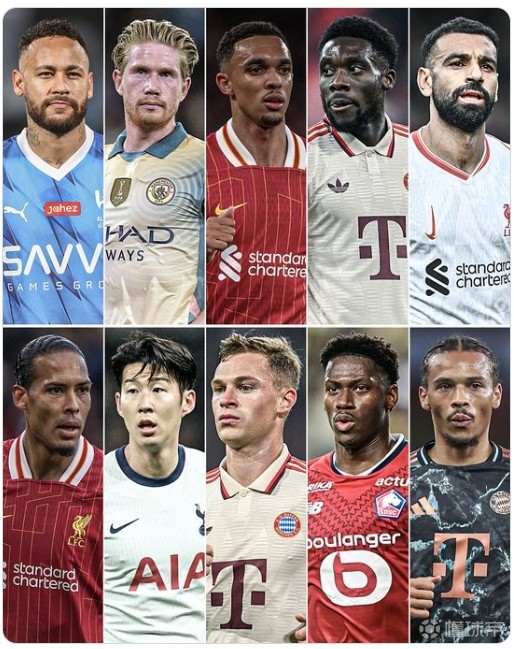 32岁的内马尔(利雅得新月)、33岁的德布劳内(曼城)、26岁的亚历山大-阿诺德(利物浦)、23岁的阿方索-戴维斯(拜仁慕尼黑)、32岁的萨拉赫(利物浦)、33岁的范戴克(利物浦)、32岁的孙兴慜(托特纳姆热刺)、29岁的基米希(拜仁慕尼黑)、24岁的乔纳森-戴维(里尔)、28岁的萨内(拜仁慕尼黑),目前他们与各自俱乐部的合同都将在明年(2025年)6月30日到期。