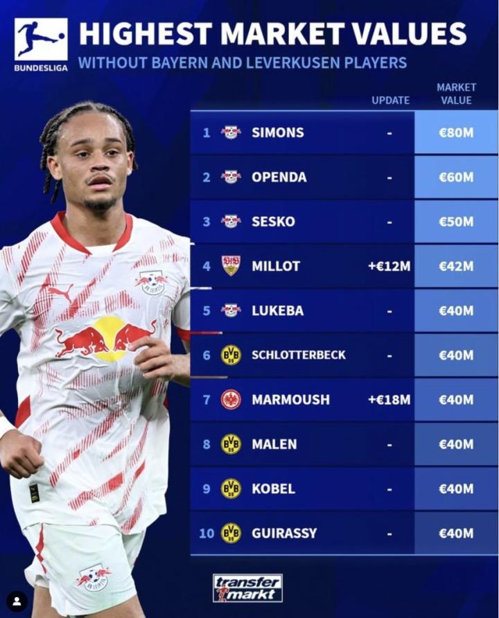 北京时间10月9日,德国转会市场更新了德甲球员身价,并列出了除拜仁、勒沃库森之外的德甲球员身价排名。