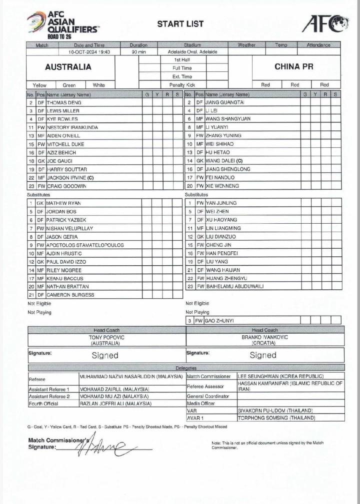 此外,澳大利亚的替补名单中,20号球员卢克-布拉坦(Luke Brattan)被打成了内森-布拉坦(Nathan Brattan)。