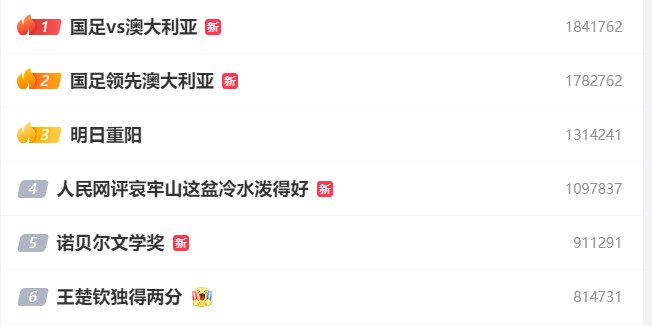 在谢文能打入进球后,本场比赛的相关词条“国足vs澳大利亚”和“国足领先澳大利亚”登顶微博热搜前二。
