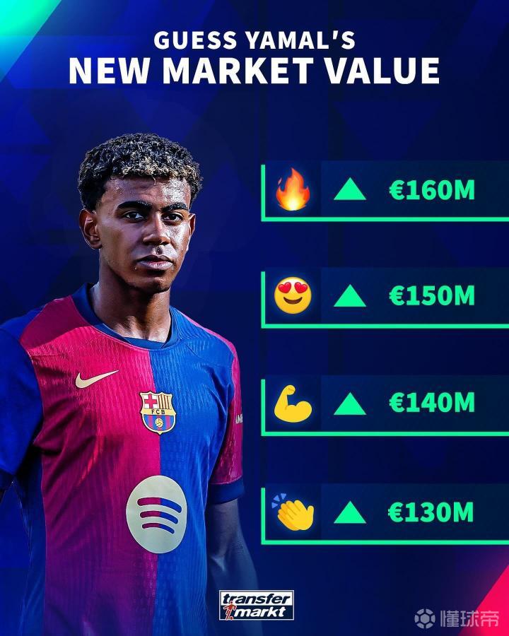今日,德国转会市场预热亚马尔身价上涨,给出了四个可能的结果,分别是1.3亿欧、1.4亿欧、1.5亿欧和1.6亿欧。