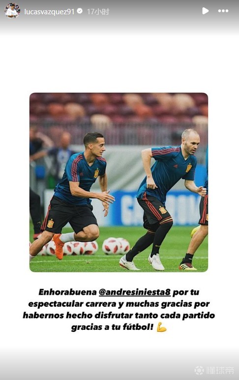 巴斯克斯晒出了自己在西班牙国家队与伊涅斯塔一起训练的照片,并配文:“伊涅斯塔,感谢你辉煌的职业生涯,非常感谢你让我们享受每一场比赛,感谢你的足球表现!”