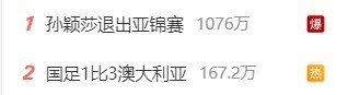 虽然当前“孙颖莎退出亚锦赛”和“国足1比3澳大利亚”排在微博热搜前两位,但前者的热度几乎可以说是碾压后者。