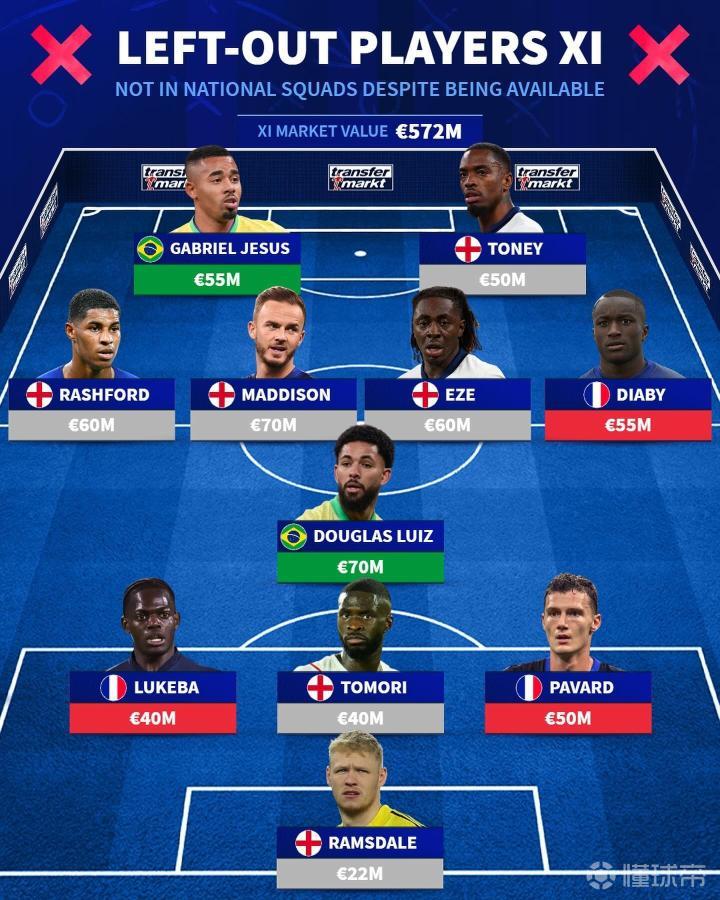 10月份国际比赛日,德国转会市场网站列出了落选国家队的最贵阵容,麦迪逊、拉什福德、热苏斯、帕瓦尔等人在列。