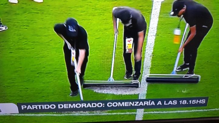 尽管进行了排水工作,但当球员们出场进行赛前热身时,球在草坪上明显无法顺畅地滚动,阿根廷国家队助理教练艾马尔通过手势表示在这样的条件下比赛是不可能的。