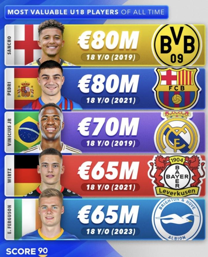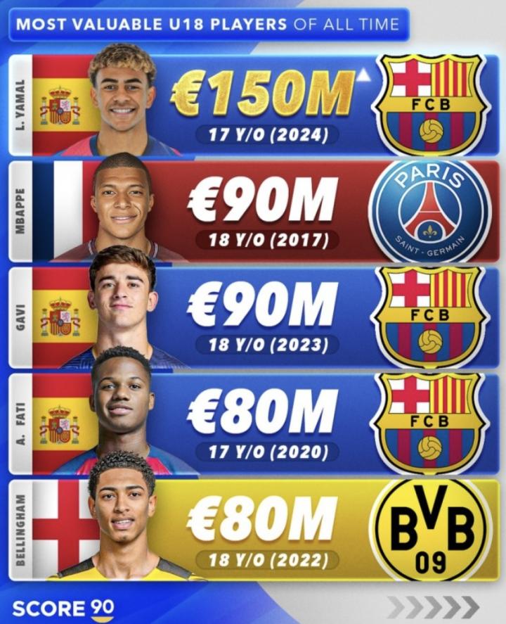 北京时间10月11日,Score90统计了德转历史上U18球员的身价估值,并列出了历史U18球员身价排行榜。其中,亚马尔1.5亿欧居首,姆巴佩、加维9000万欧并列第二。