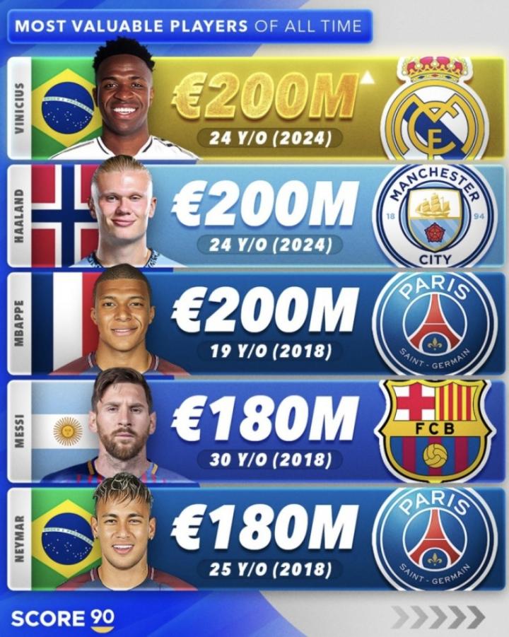 北京时间10月11日, Score90列出了德转历史球员最高身价榜单,其中维尼修斯、哈兰德、姆巴佩2亿欧居首。