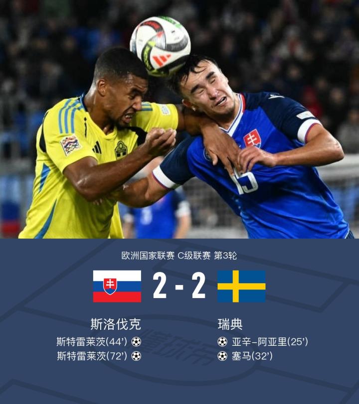 斯洛伐克连追两球2-2瑞典,塞马破门,斯特雷莱茨梅开二度