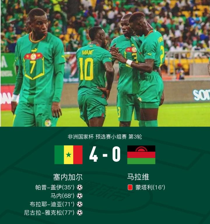塞内加尔4-0轻取十人马拉维,马内破门+造红,雅克松建功