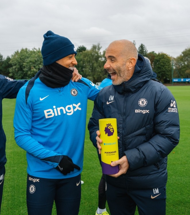 切尔西官方社交账号晒出了球队主帅马雷斯卡领取英超9月份最佳教练奖杯的照片:“😁🥇”在爱将桑乔的见证下,在这收获荣誉的时刻,马雷斯卡也是笑得合不拢嘴。