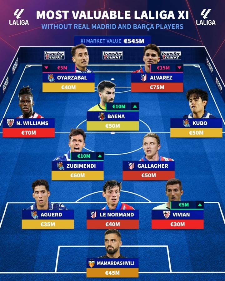 在更新了西甲球员身价后,德国转会市场网站列出了皇马、巴萨球员以外的西甲最贵阵容,阿尔瓦雷斯、加拉格尔、久保建英在列。