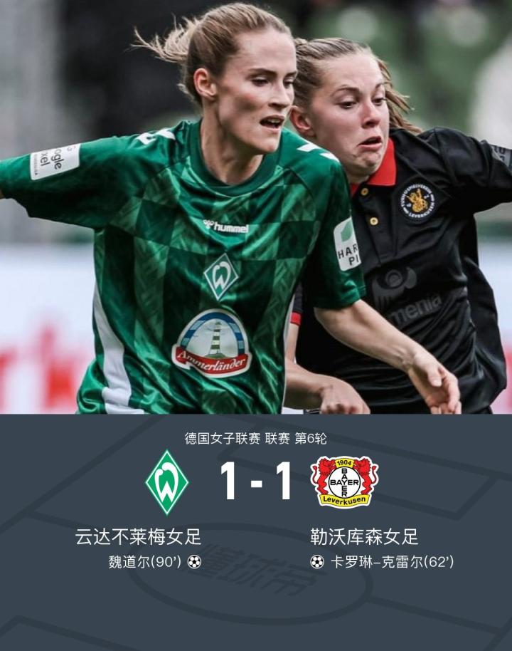 不莱梅女足1-1勒沃库森女足,沈梦露替补未登场,魏道尔绝平