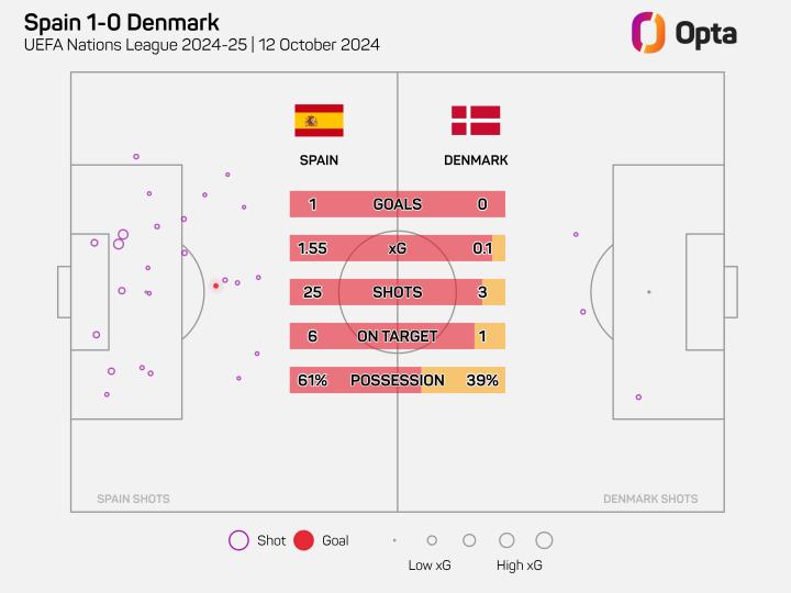 西班牙在本场比赛中对丹麦形成了围攻之势,全场比赛他们一共进行了25次射门的尝试,其中有6次射正球门,最终成功打进1球。