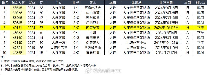 中甲的比赛中,大连英博以2-0的比分击败南京城市。本场比赛,有49151名观众涌入大连梭鱼湾专业足球场。而在本场比赛后,中甲历史上座前10均为大连球队。