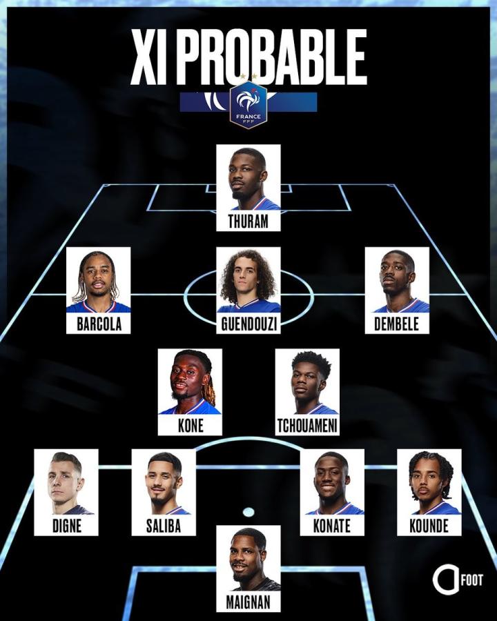 与上一场法国队客场4-1大胜以色列的比赛相比,RMC体育的报道认为,本场比赛德尚将会轮换5名球员,马库斯-图拉姆担任突前前锋,贡多齐出任前腰,巴尔科拉出任左前卫,夸迪奥-科内出任中前卫,迪涅出任左后卫。