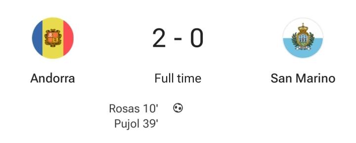 北京时间10月14日,世界排名第169位的安道尔依靠乌瓦奇和霍普尔的进球在一场友谊赛中2-0击败了世界排名倒数第一(第210位)的圣马力诺。