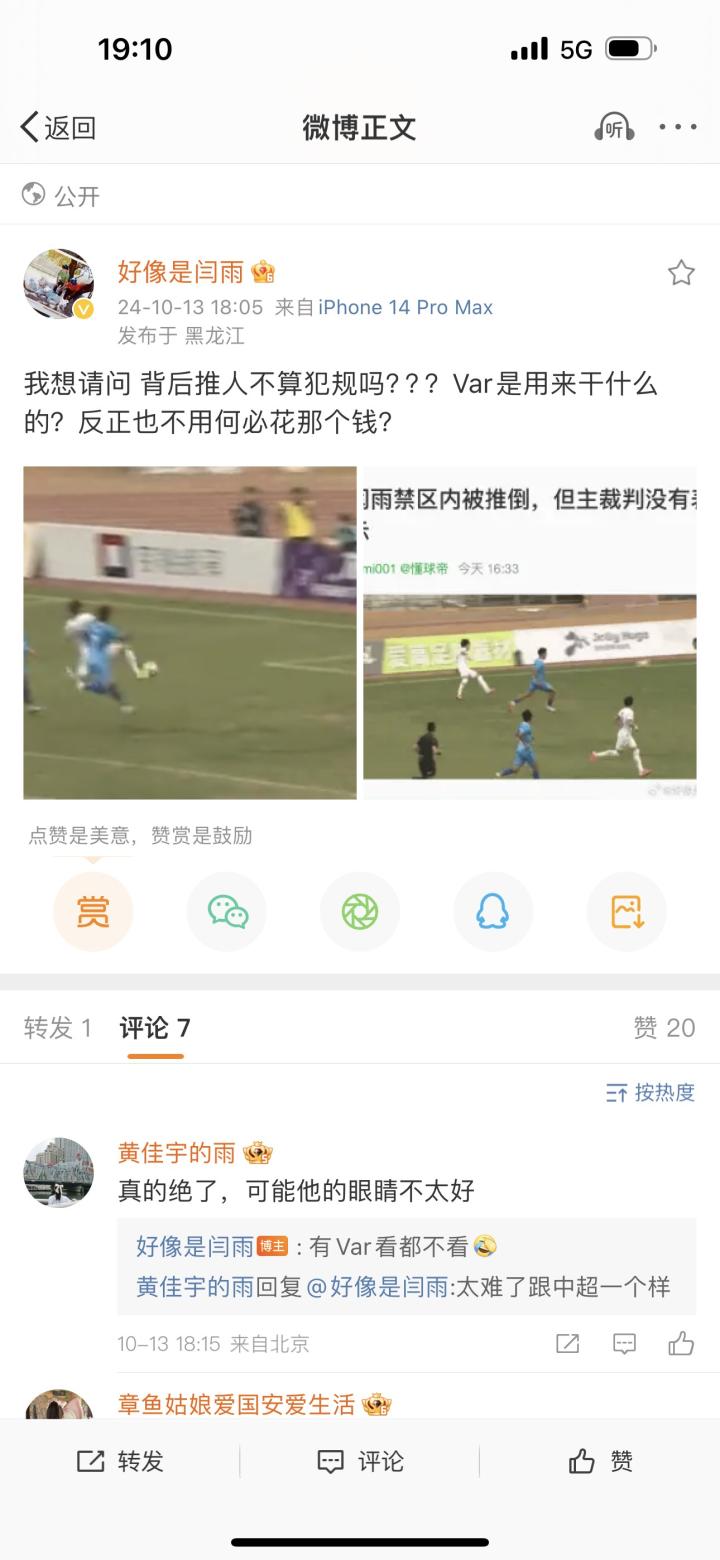 闫雨写道:“我想请问,背后推人不算犯规吗???VAR是用来干什么的?反正也不用,何必花那个钱?”随后,他删除了这条微博动态。