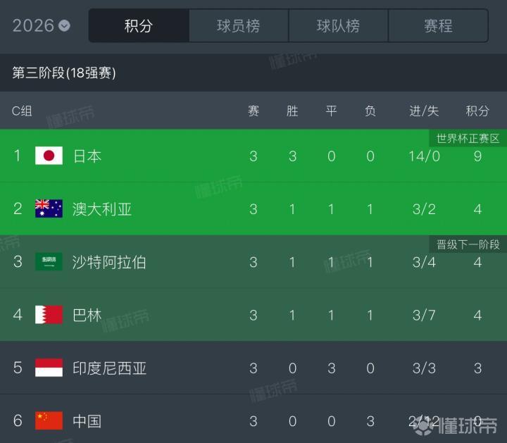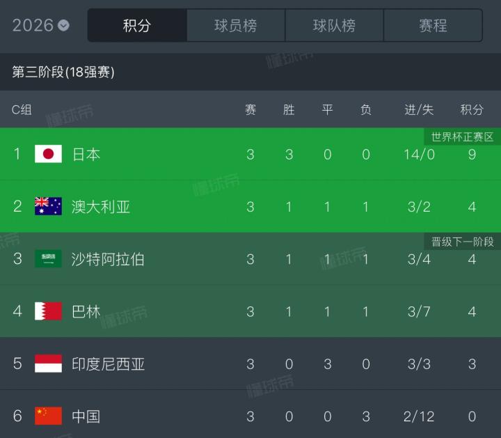 国足18强赛前三战输给的日本队(9分,小组第一)、澳大利亚队(4分,小组第二)、沙特队(4分,小组第三),刚好是本组排名前三的队伍。巴林队(4分,第四)1胜1平1负中规中矩,虽然巴林的胜利是客场爆冷赢了澳大利亚,但主场被印尼逼平拖住了积分。印尼队三场平局积3分,目前排在小组第五。