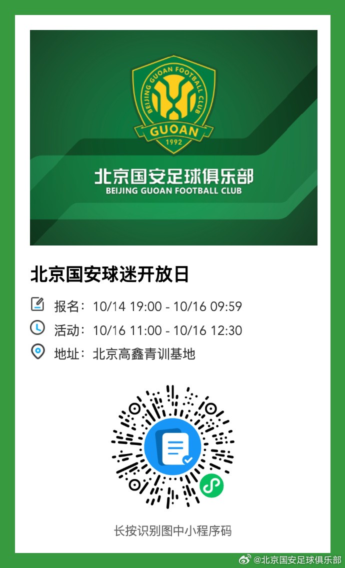 北京时间10月14日,北京国安足球俱乐部官方微博发布通知,球队将在10月16日(本周三)举行公开训练课,现诚邀球迷朋友们报名参与,报名将于今天19:00开启。