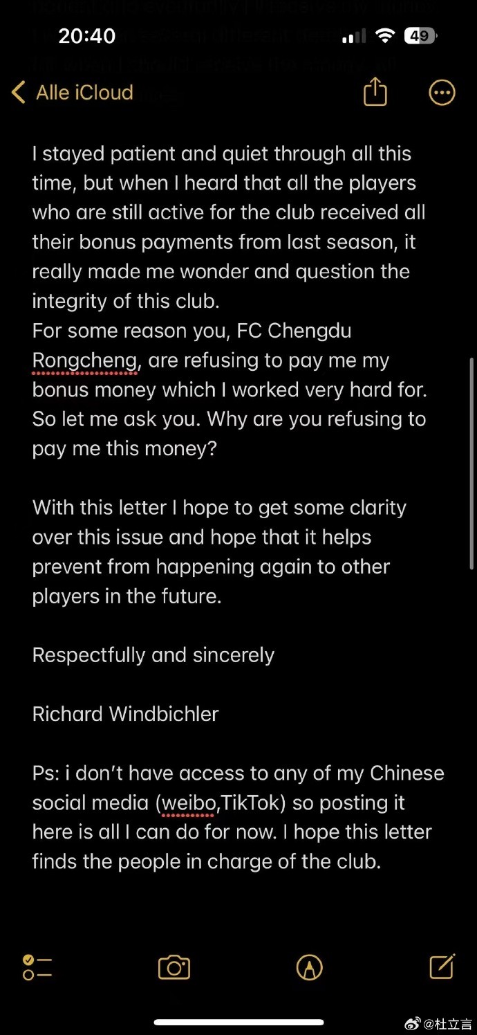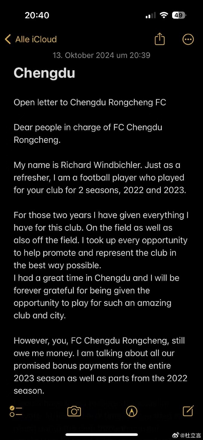 北京时间10月14日,媒体人杜立言在个人微博上发布了前成都蓉城外援理查德的朋友圈截图。理查德称成都蓉城目前还拖欠着自己2023赛季的全部奖金及2022赛季的部分奖金。