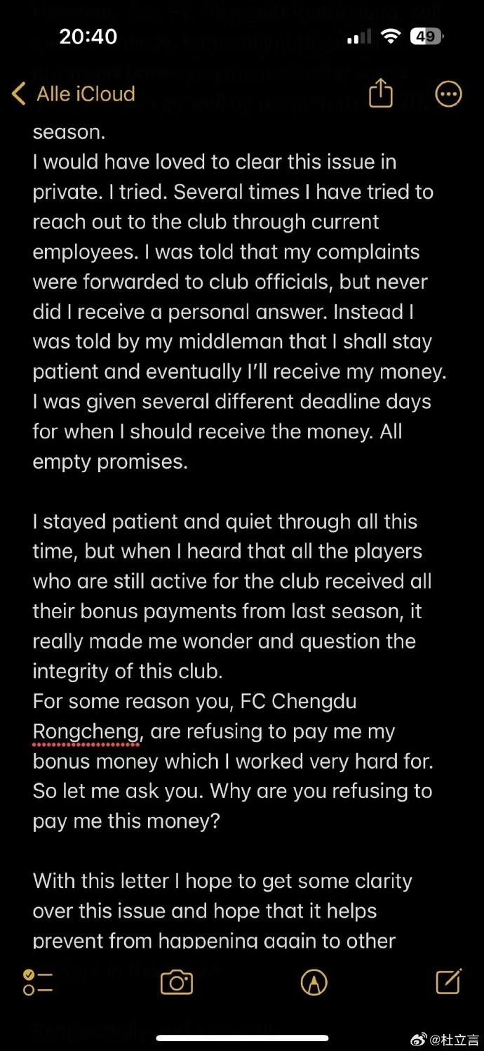 然而,你,成都蓉城俱乐部,仍然拖欠我金钱。我所说的是整个2023赛季的奖金以及2022赛季的部分奖金。