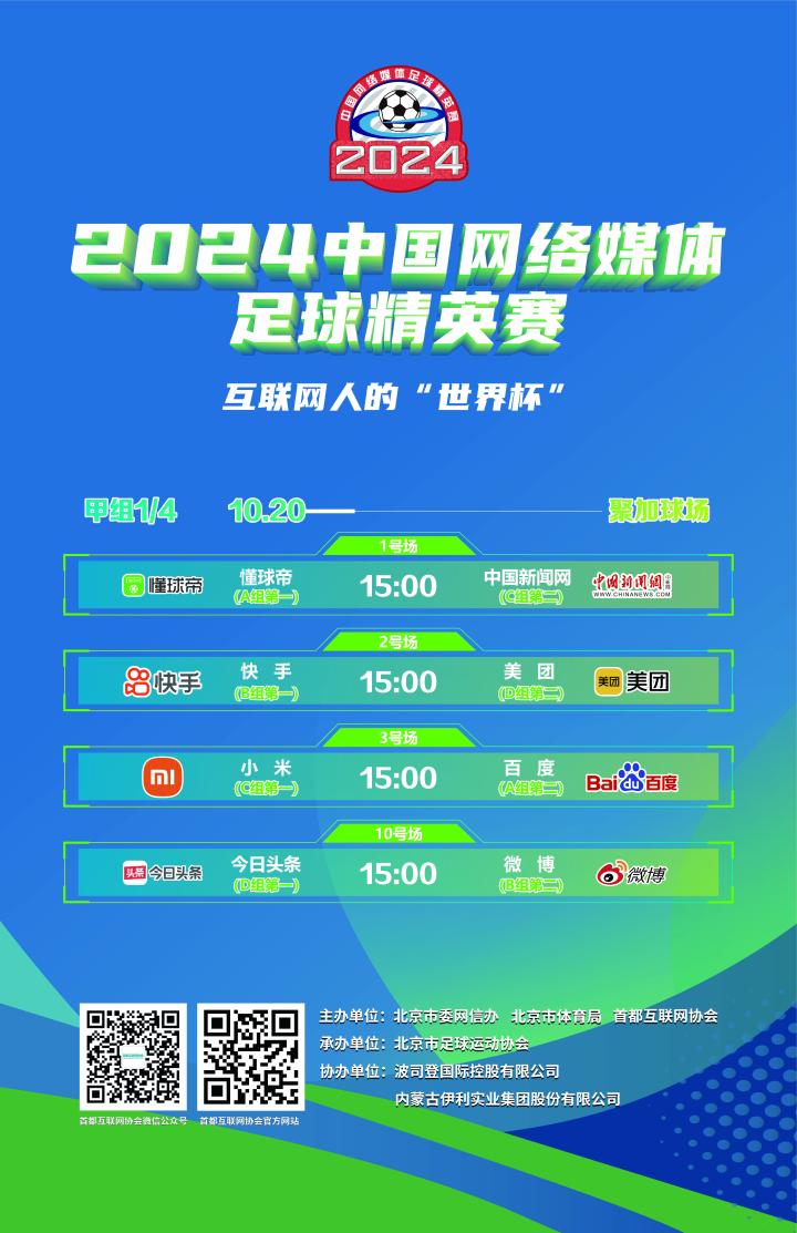 北京时间10月20日,2024中国网络媒体足球精英赛甲组1/4决赛即将打响,目前赛程已经公布。