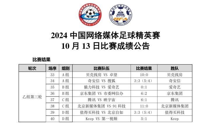 北京时间10月13日,中国网络媒体足球精英赛乙组第三轮战罢,最终赛果如下: