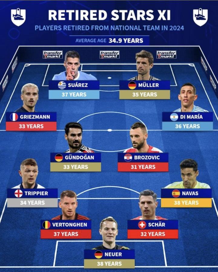 北京时间10月14日,德国转会市场列出了今年从国家队退役的球员阵容。其中,诺伊尔、穆勒、格列兹曼、苏亚雷斯等人在列。
