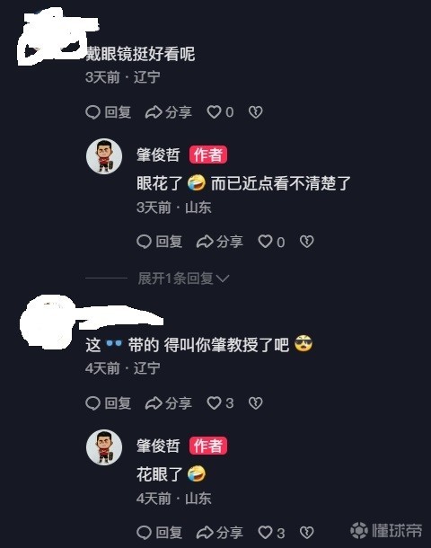 看到肇俊哲戴上眼镜,这也引起了网友们的“关注”。对此,肇俊哲在评论区回复说:“花眼了。”