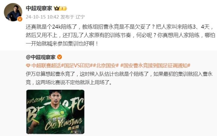今天,该博主再次发文表示:“还真就是个24K陪练了,(国足)教练组招曹永竞是不是欠妥了?把人家叫来陪练3、4天,然后又用不上,还打乱了人家原有的训练节奏,何必呢?你真想用人家陪练,哪怕一开始就喊来参加集训也好啊!”