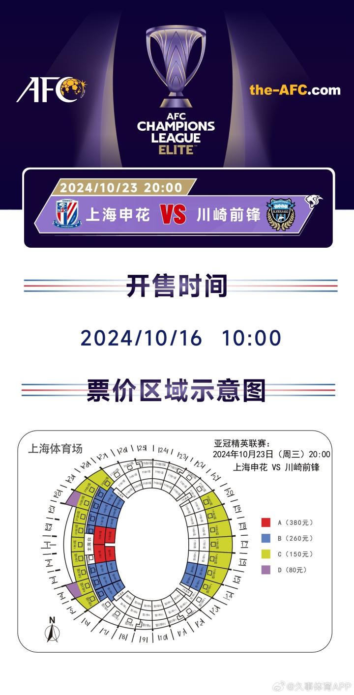 申花官方消息,亚冠精英联赛主场对阵川崎前锋的门票将于16日上午10点开售。