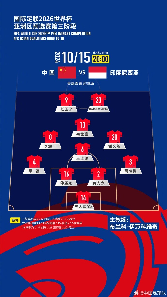 10月15日,国足官方公布了主场对阵印尼的阵型,其中阵型为菱形4-4-2,韦世豪前腰,王上源单后腰,张玉宁与拜合拉木搭档双前锋。