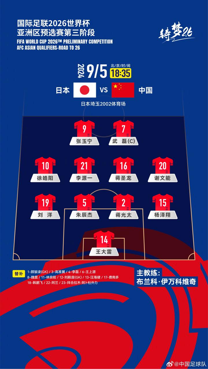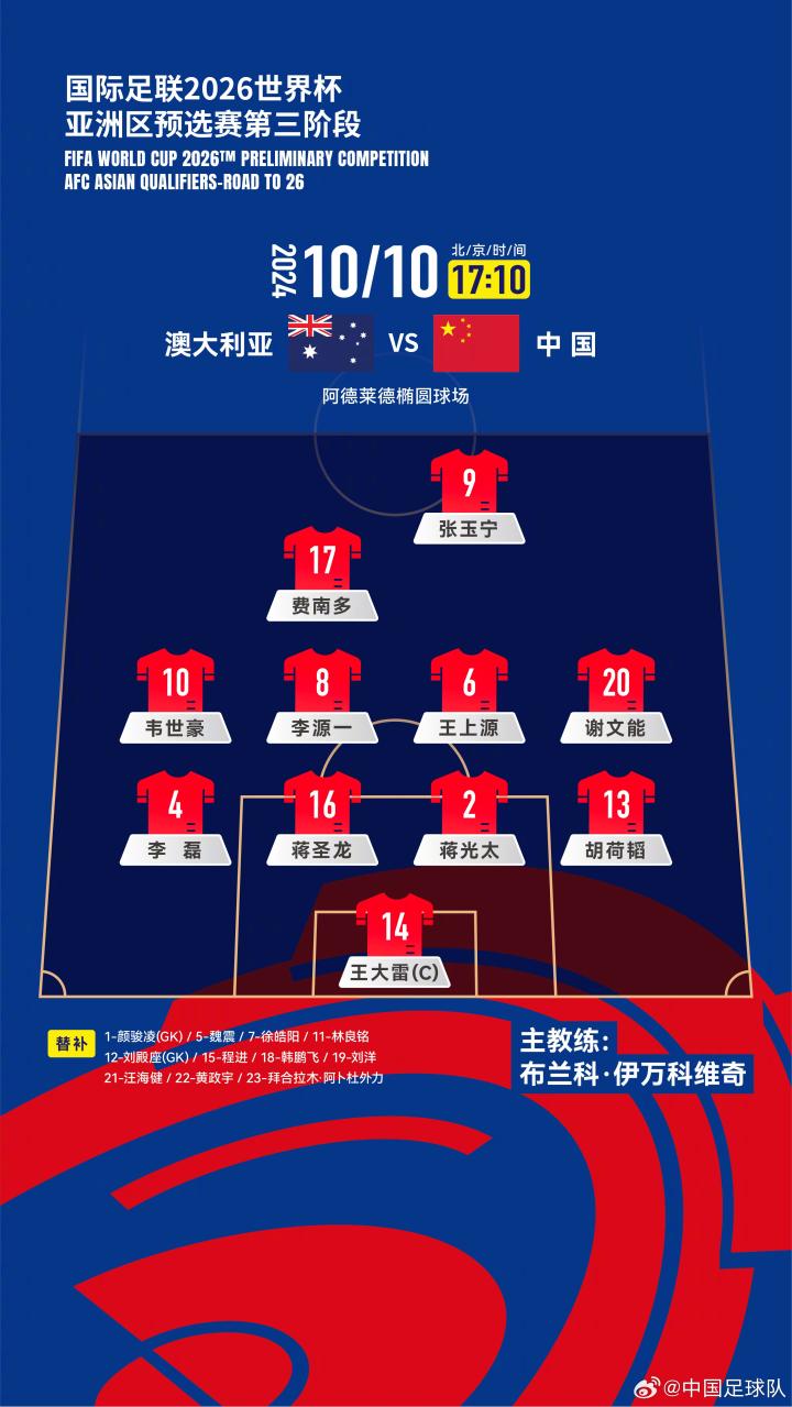 14-王大雷、15-杨泽翔、2-蒋光太、5-朱辰杰、19-刘洋、10-徐皓阳、16-蒋圣龙、21-李源一、20-谢文能、7-武磊、9-张玉宁