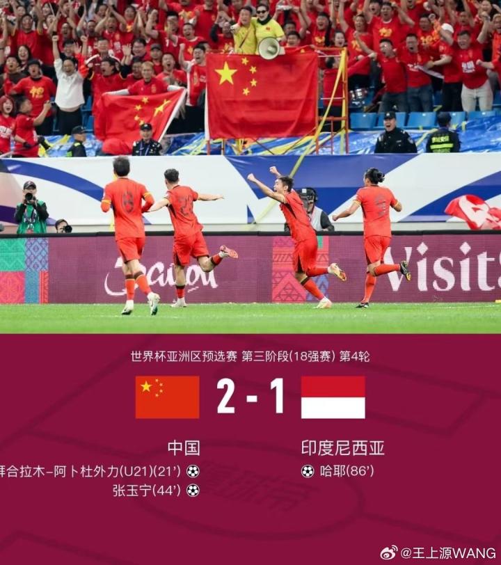 国足2-1击败印度尼西亚,取得本届18强赛首胜。比赛结束后,王上源更新微博庆祝胜利。