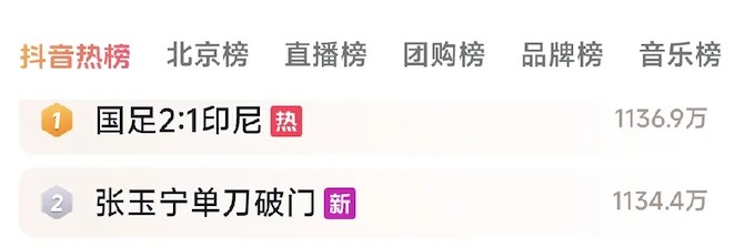 赛后,国足相关话题包揽抖音热榜前二,分别是“国足2-1印尼”和“张玉宁单刀破门”。