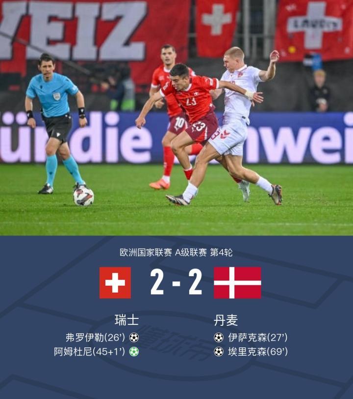 瑞士2-2丹麦,埃里克森传射,弗罗伊勒、阿姆杜尼破门