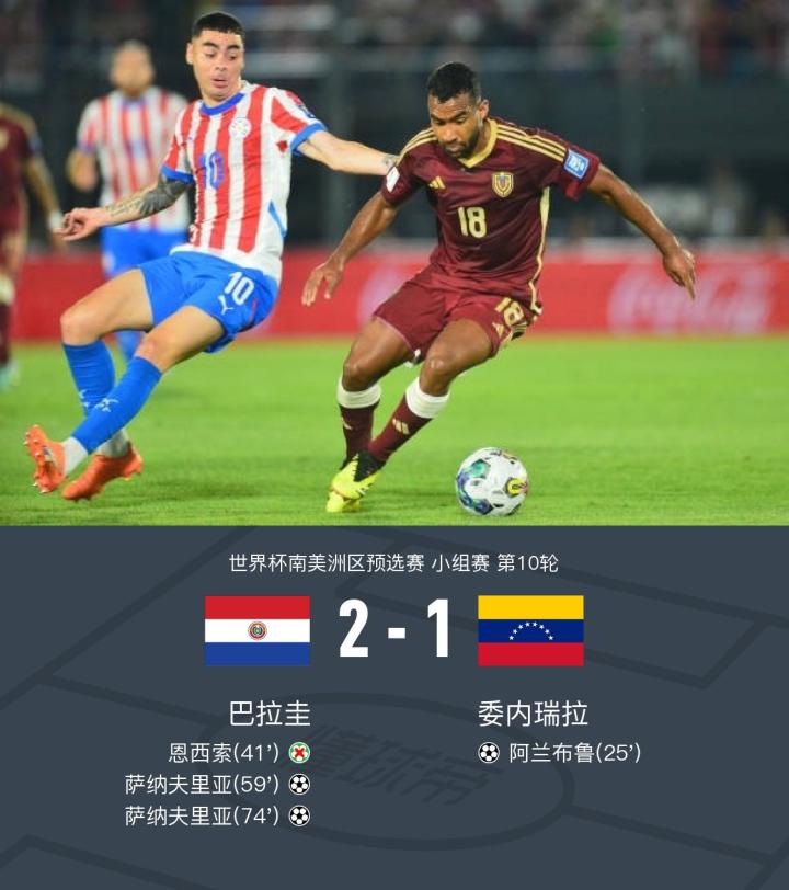 巴拉圭2-1逆转委内瑞拉,恩西索丢点,萨纳夫里亚替补双响